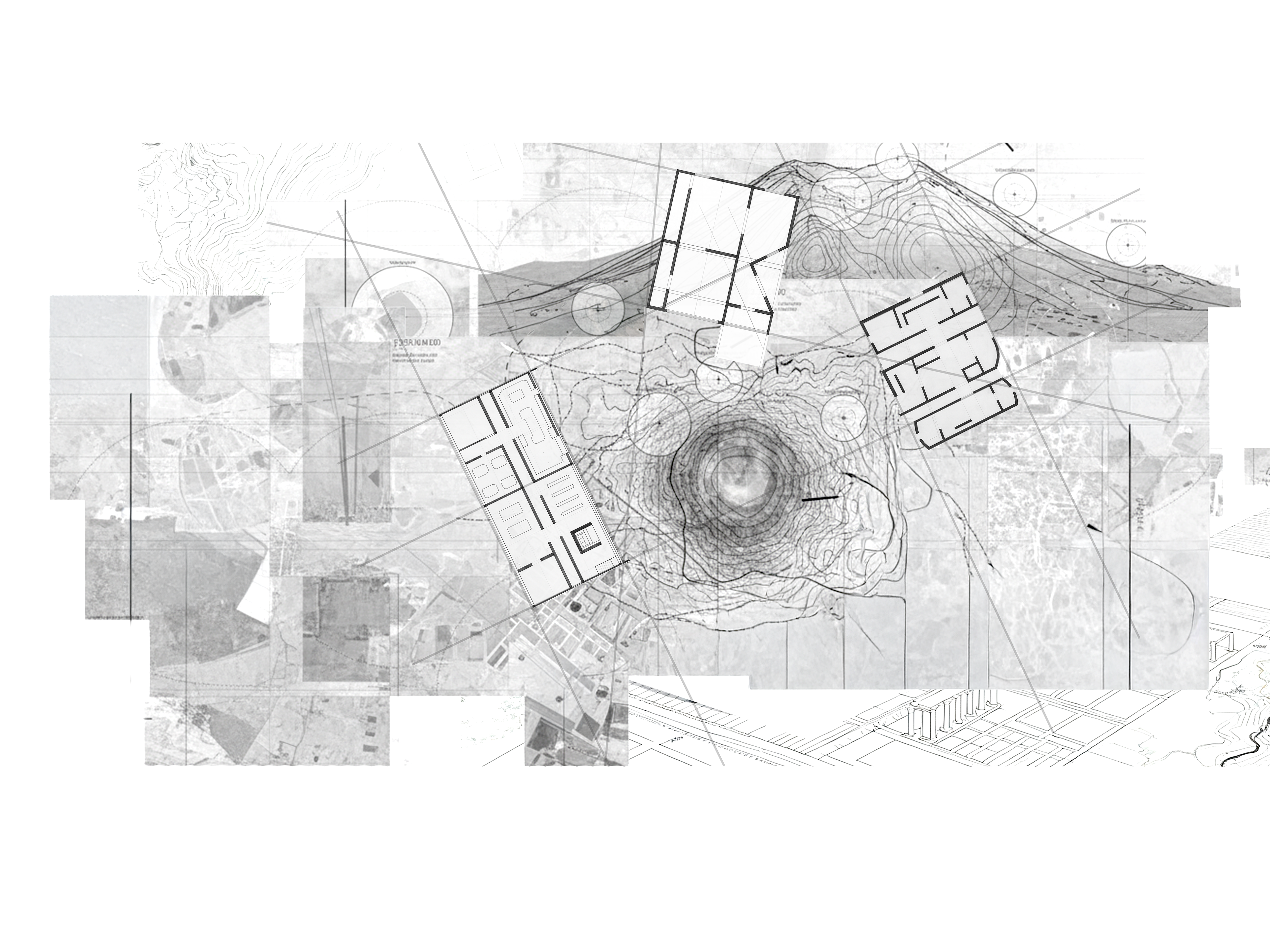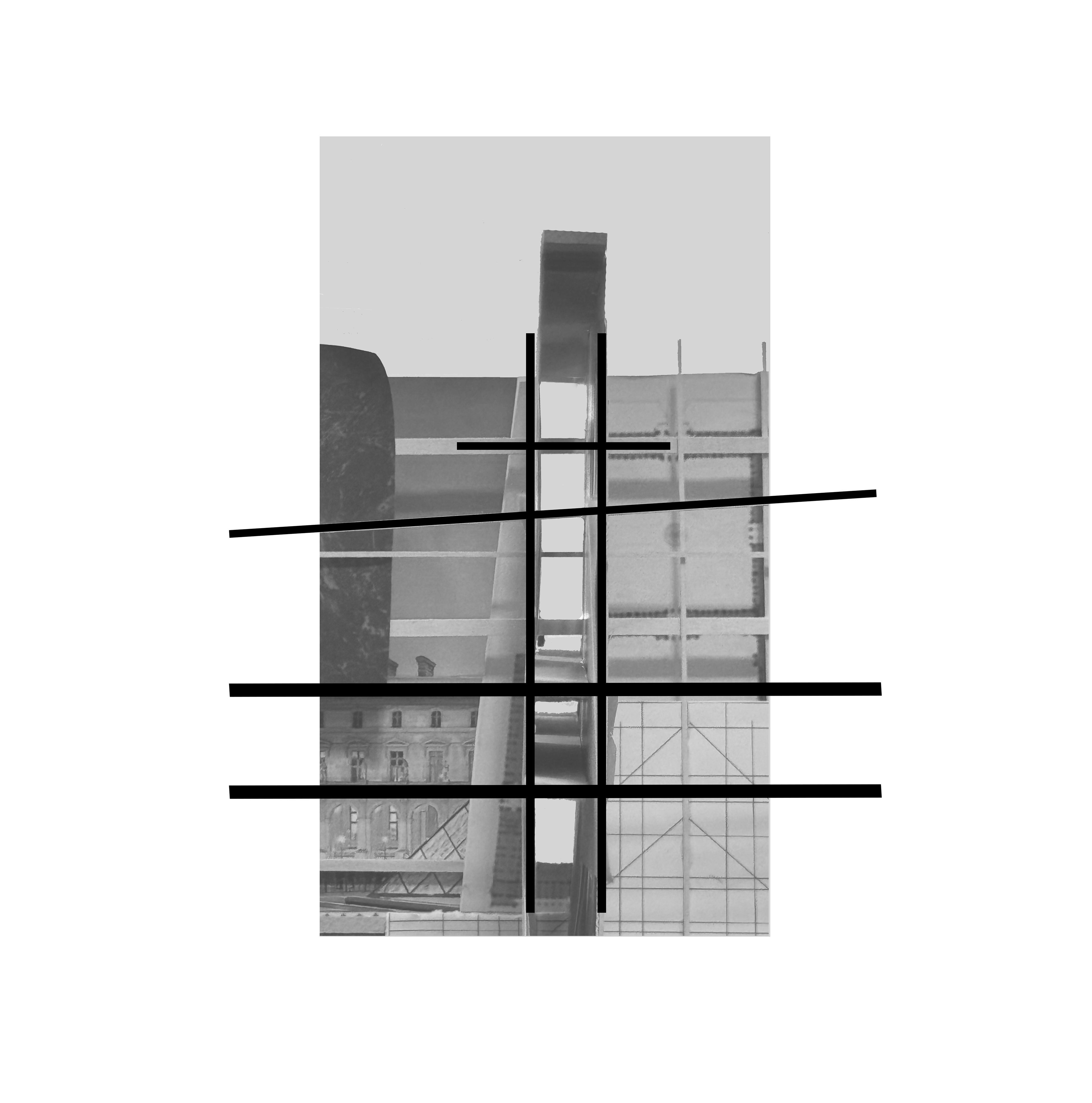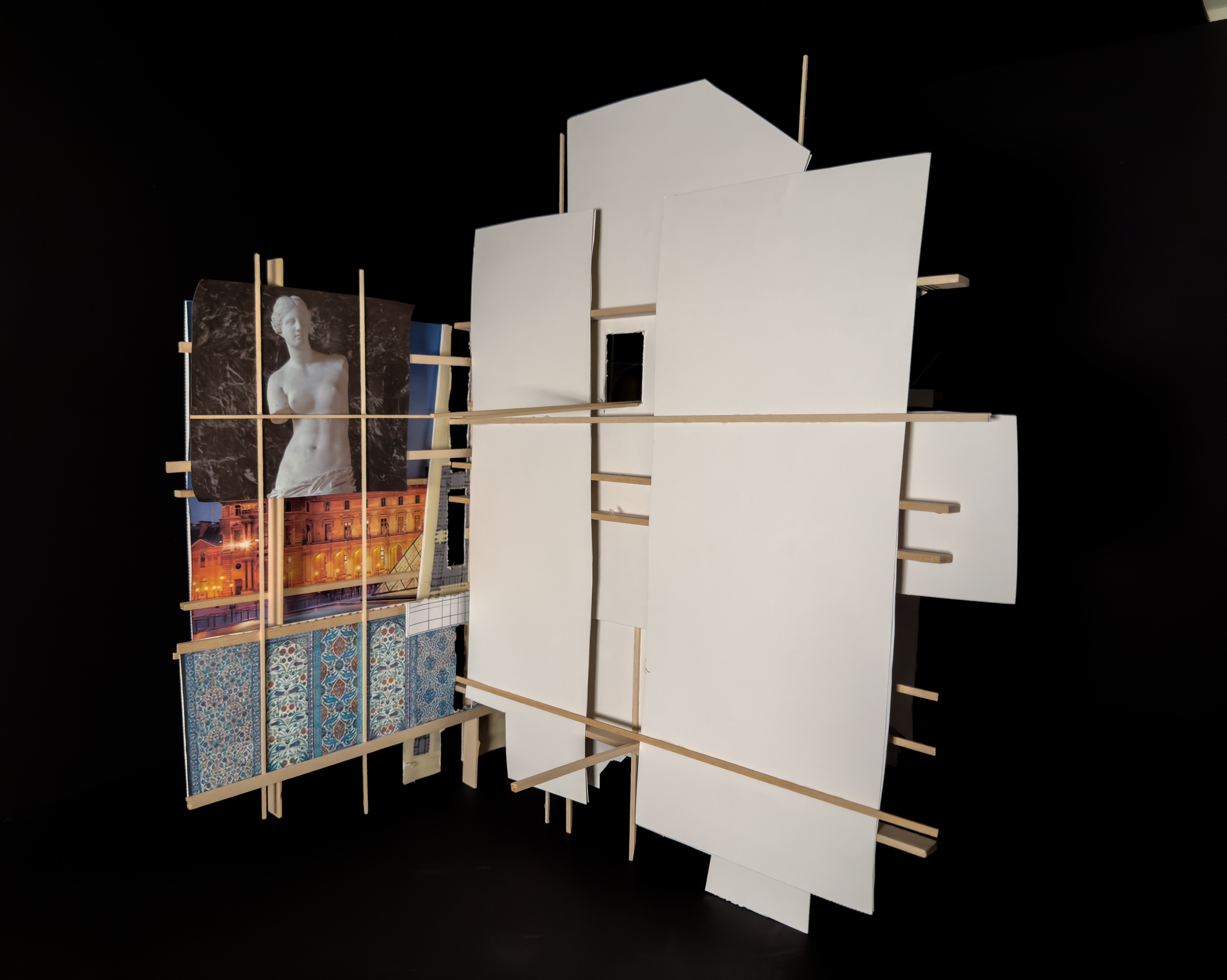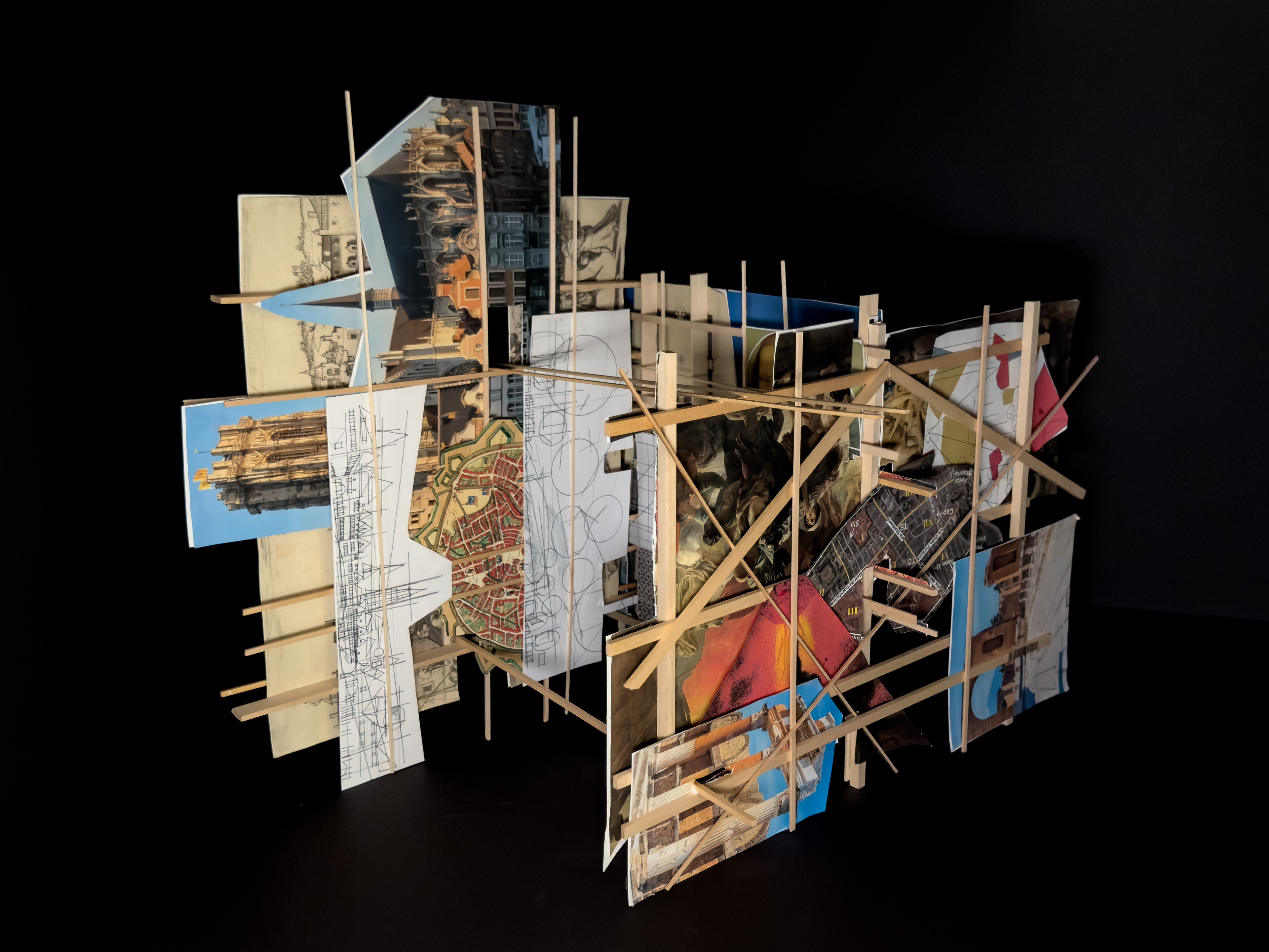 These base images were dissected and researched using collage to suggest space and gesture. These analyses boiled down into relief models, which still operated diagrammatically. These relief models were then made to intersect into a final construct - at this point, scaleless and program-less.