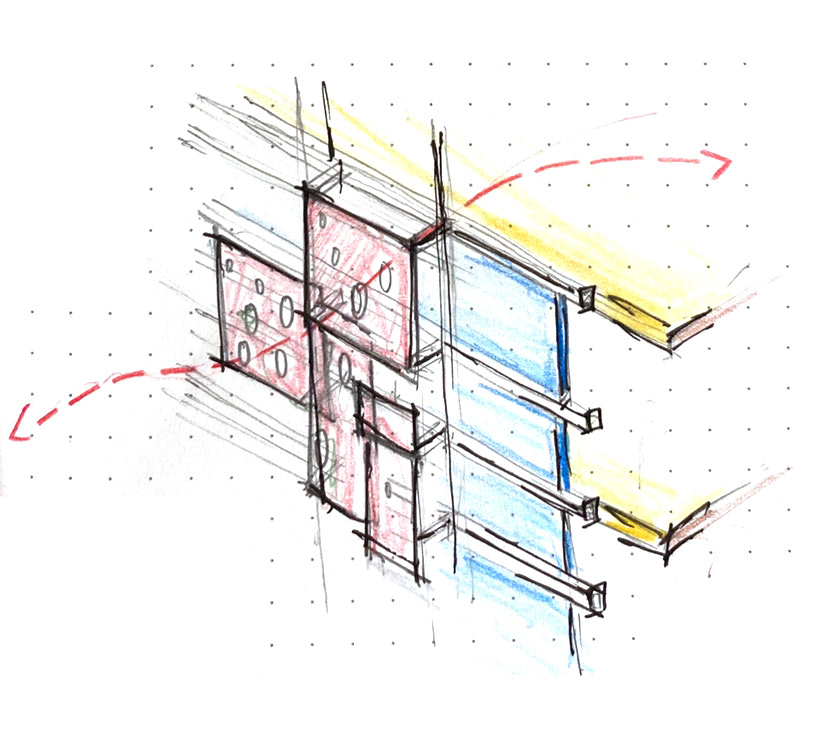 The perforated, panelized screen functions as a complement to the gesture of the Pearl, shading for residents, and a solar collection apparatus.